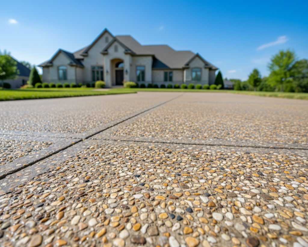 For a sophisticated, natural look, we wash away the top layer to reveal the smooth, colorful stones and pebbles within the concrete. This creates a stunning, jewel-like texture that is incredibly durable. It's the perfect, high-traction finish for a beautiful pool deck or driveway.