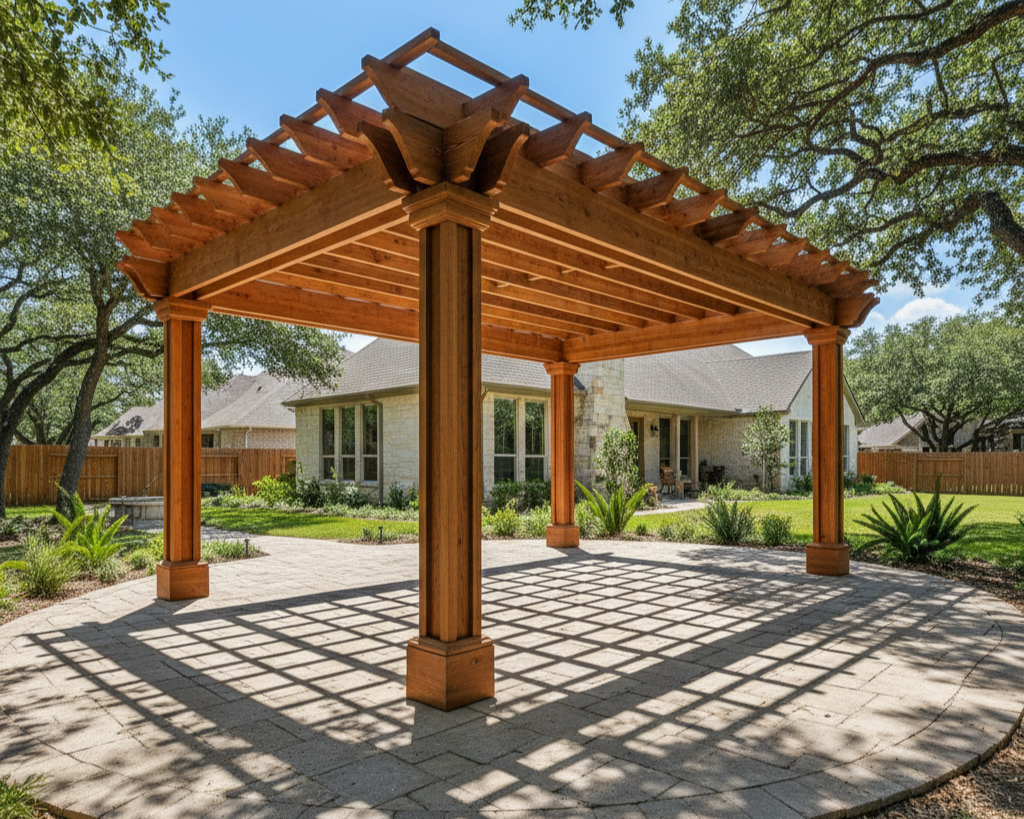Embrace the timeless charm of Texas with a custom Western Red Cedar pergola. This classic design defines your space with an open-lattice roof, offering partial shade while maintaining an airy, open-sky feel. It's the perfect architectural centerpiece for any patio or garden.